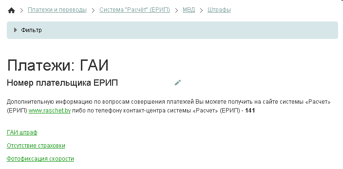 Внимание! Прием платежей по штрафам, налагаемым подразделениями ГАИ МВД, вне системы «Расчет» ЕРИП не допускается.